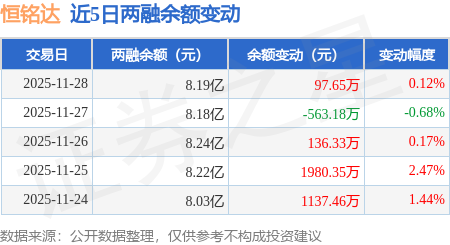 证券之星消息,11月28日,恒铭达(002947)融资买入1637.72万元,融资偿还1572.48万元,融资净买入65.24万元,融资余额8.19亿元,近20个交易日中有13个交易日出现融资净买入。