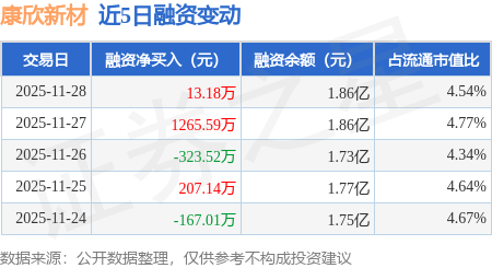 证券之星消息,11月28日,康欣新材(600076)融资买入1610.28万元,融资偿还1597.11万元,融资净买入13.18万元,融资余额1.86亿元。
