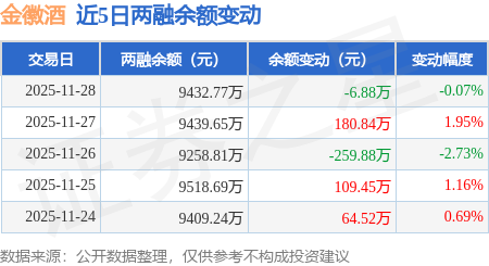 证券之星消息,11月28日,金徽酒(603919)融资买入637.4万元,融资偿还646.95万元,融资净卖出9.55万元,融资余额9188.36万元。