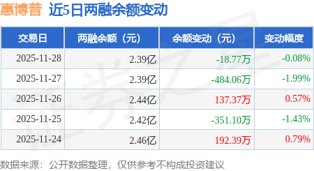 证券之星消息,11月28日,惠博普(002554)融资买入1496.39万元,融资偿还1515.17万元,融资净卖出18.77万元,融资余额2.39亿元,近20个交易日中有11个交易日出现融资净买入。