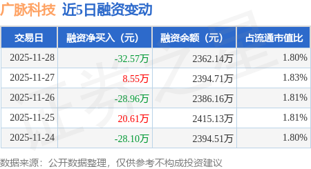 证券之星消息,11月28日,广脉科技(920924)融资买入115.16万元,融资偿还147.73万元,融资净卖出32.57万元,融资余额2362.14万元,近20个交易日中有11个交易日出现融资净买入。
