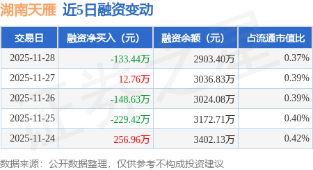 证券之星消息,11月28日,湖南天雁(600698)融资买入164.72万元,融资偿还298.16万元,融资净卖出133.44万元,融资余额2903.4万元。