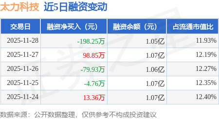 证券之星消息,11月28日,太力科技(301595)融资买入91.3万元,融资偿还289.55万元,融资净卖出198.25万元,融资余额1.05亿元。