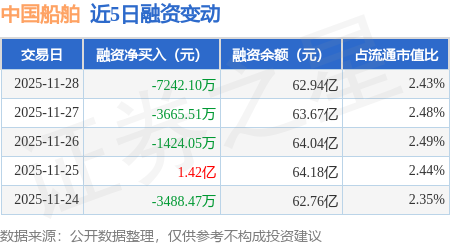 证券之星消息,11月28日,中国船舶(600150)融资买入1.27亿元,融资偿还2.0亿元,融资净卖出7242.1万元,融资余额62.94亿元。