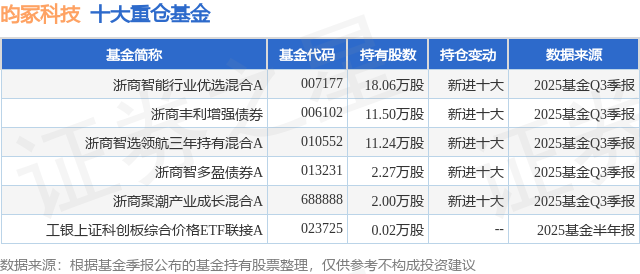 根据2025基金Q3季报公募基金重仓股数据,重仓该股的公募基金共5家,其中持有数量最多的公募基金为浙商基金的浙商智能行业优选混合A。浙商智能行业优选混合A目前规模为5.84亿元,最新净值1.2579(11月28日),较上一交易日上涨0.81%,近一年上涨37.8%。该公募基金现任基金经理为饶祖华。饶祖华在任的基金产品包括:浙商中证500增强A,管理时间为2025年8月25日至今,期间收益率为2.76%;浙商丰利增强债券,管理时间为2025年8月25日至今,期间收益率为-1.82%;浙商智多盈债券A,管理时间为2025年8月25日至今,期间收益率为-0.16%;浙商中证1000指数增强A,管理时间为2025年8月25日至今,期间收益率为-0.02%。