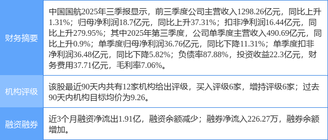 2025年11月2日,国金证券研究员郑树明,王凯婕发布了对中国国航的研报《Q3收益水平下降,业绩小幅下滑》,该研报对中国国航给出“买入”评级。证券之星数据中心根据近三年发布的研报数据计算,该研报作者对此股的盈利预测准确度为10.2%。