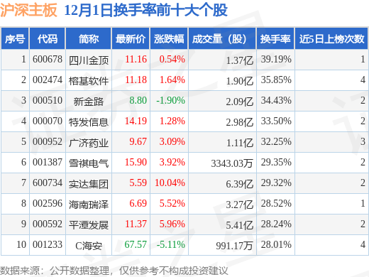 当日沪深主板换手率前10大个股中8只个股收涨,平均涨幅4.0%,其中四川金顶(600678)以换手率39.19%排第一,8只个股近5个交易日中多次上榜。