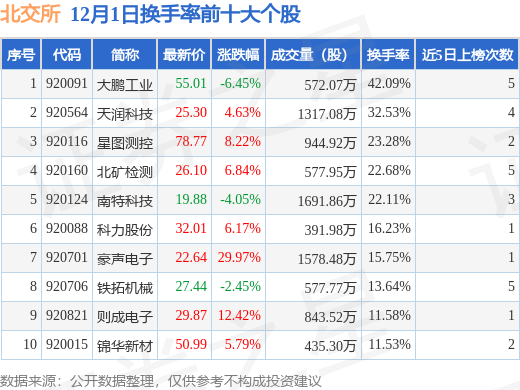 当日北交所换手率前10大个股中7只个股收涨,平均涨幅10.58%,其中大鹏工业(920091)以换手率42.09%排第一,7只个股近5个交易日中多次上榜。