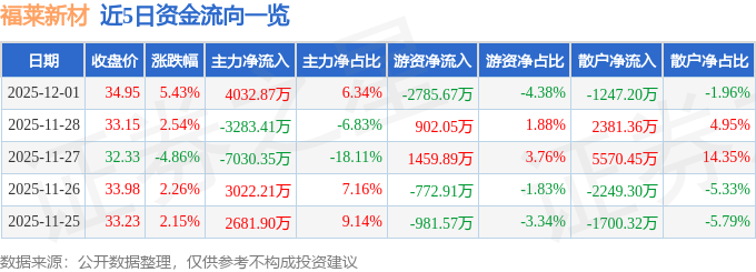 证券之星消息,截至2025年12月1日收盘,福莱新材(605488)报收于34.95元,上涨5.43%,换手率6.8%,成交量18.78万手,成交额6.37亿元。