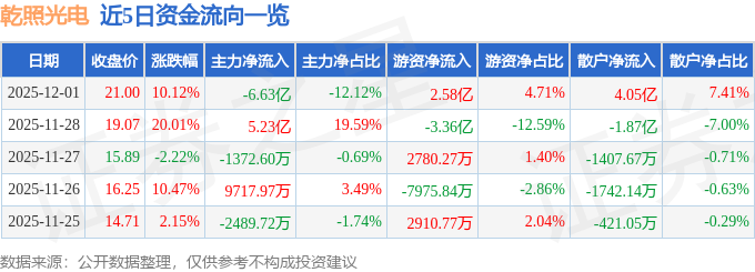 证券之星消息,截至2025年12月1日收盘,乾照光电(300102)报收于21.0元,上涨10.12%,换手率28.54%,成交量261.56万手,成交额54.68亿元。