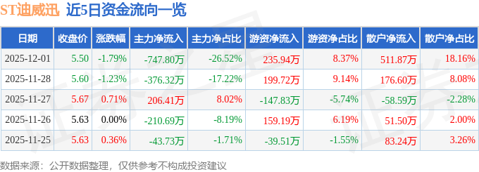 证券之星消息,截至2025年12月1日收盘,ST迪威迅(300167)报收于5.5元,下跌1.79%,换手率1.43%,成交量5.12万手,成交额2819.28万元。