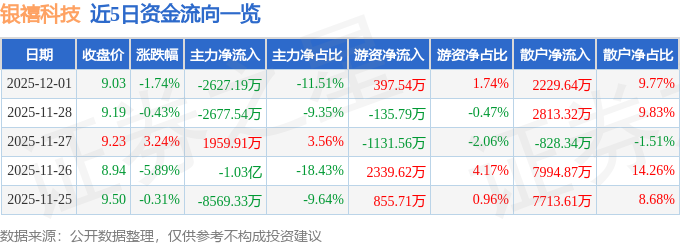 证券之星消息,截至2025年12月1日收盘,银禧科技(300221)报收于9.03元,下跌1.74%,换手率5.5%,成交量25.13万手,成交额2.28亿元。