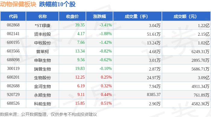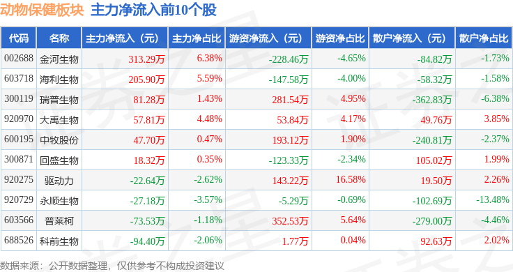 从资金流向上来看,当日动物保健板块主力资金净流出2956.64万元,游资资金净流入2629.62万元,散户资金净流入327.02万元。动物保健板块个股资金流向见下表: