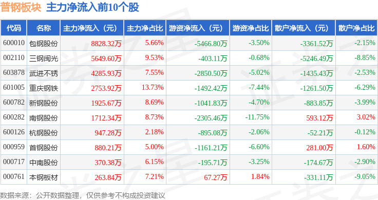 从资金流向上来看,当日普钢板块主力资金净流入2.13亿元,游资资金净流出1.35亿元,散户资金净流出7820.26万元。普钢板块个股资金流向见下表: