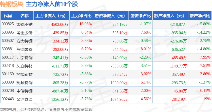 从资金流向上来看,当日特钢板块主力资金净流出4891.54万元,游资资金净流入1364.05万元,散户资金净流入3527.5万元。特钢板块个股资金流向见下表: