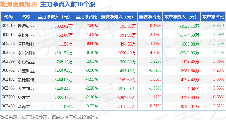 从资金流向上来看,当日能源金属板块主力资金净流出7.06亿元,游资资金净流入9716.17万元,散户资金净流入6.09亿元。能源金属板块个股资金流向见下表: