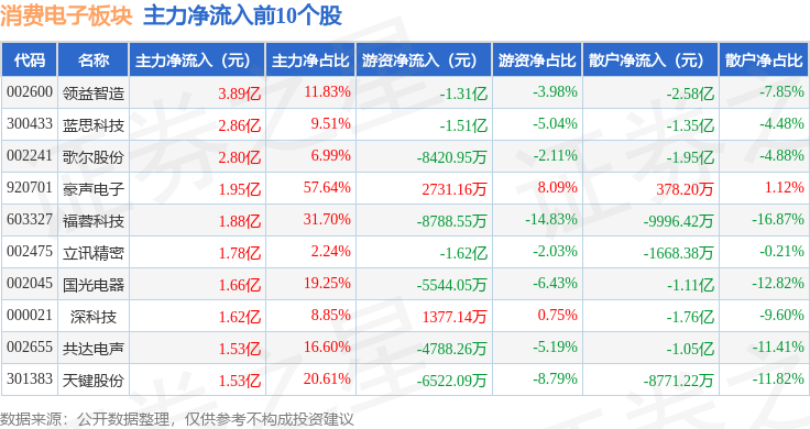 从资金流向上来看,当日消费电子板块主力资金净流入13.47亿元,游资资金净流出6.09亿元,散户资金净流出7.39亿元。消费电子板块个股资金流向见下表: