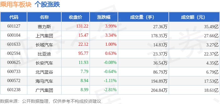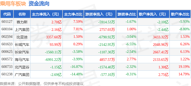 从资金流向上来看,当日乘用车板块主力资金净流入5041.94万元,游资资金净流出1.05亿元,散户资金净流入5450.65万元。乘用车板块个股资金流向见下表: