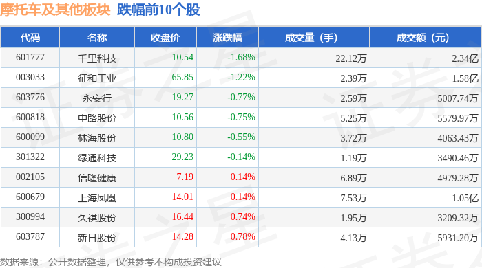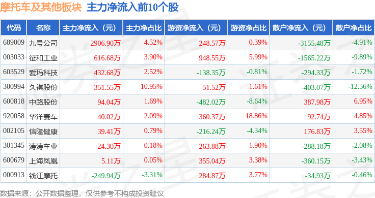从资金流向上来看,当日摩托车及其他板块主力资金净流出3757.76万元,游资资金净流入1.06亿元,散户资金净流出6879.43万元。摩托车及其他板块个股资金流向见下表: