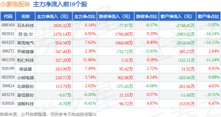 从资金流向上来看,当日小家电板块主力资金净流出3503.82万元,游资资金净流入1916.02万元,散户资金净流入1587.8万元。小家电板块个股资金流向见下表: