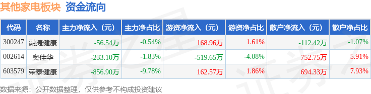 从资金流向上来看,当日其他家电板块主力资金净流出1146.54万元,游资资金净流出188.12万元,散户资金净流入1334.66万元。其他家电板块个股资金流向见下表: