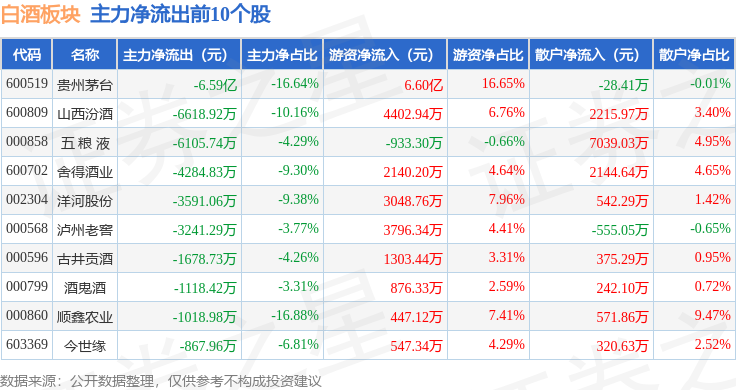 从资金流向上来看,当日白酒板块主力资金净流出9.69亿元,游资资金净流入8.09亿元,散户资金净流入1.6亿元。白酒板块个股资金流向见下表: