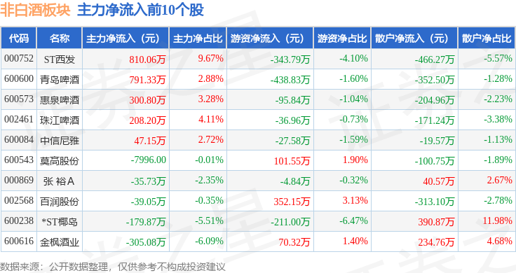 从资金流向上来看,当日非白酒板块主力资金净流出2610.67万元,游资资金净流出1392.78万元,散户资金净流入4003.44万元。非白酒板块个股资金流向见下表: