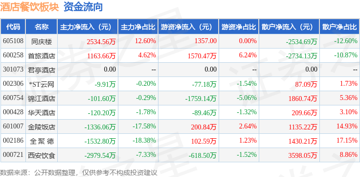 从资金流向上来看,当日酒店餐饮板块主力资金净流出2381.9万元,游资资金净流出670.24万元,散户资金净流入3052.14万元。酒店餐饮板块个股资金流向见下表: