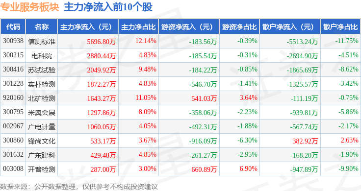 从资金流向上来看,当日专业服务板块主力资金净流入7205.19万元,游资资金净流入1345.19万元,散户资金净流出8550.38万元。专业服务板块个股资金流向见下表: