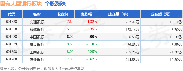证券之星消息,12月1日国有大型银行板块较上一交易日下跌0.26%,农业银行领跌。当日上证指数报收于3914.01,上涨0.65%。深证成指报收于13146.72,上涨1.25%。国有大型银行板块个股涨跌见下表: