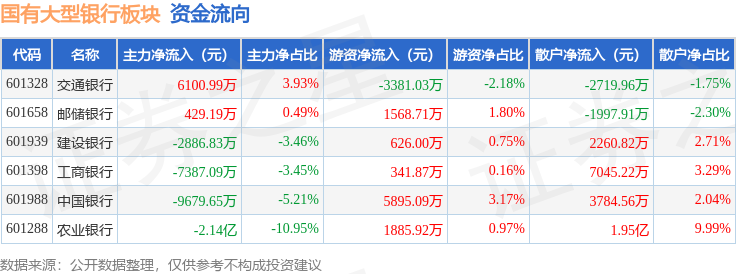 从资金流向上来看,当日国有大型银行板块主力资金净流出3.48亿元,游资资金净流入6936.57万元,散户资金净流入2.79亿元。国有大型银行板块个股资金流向见下表: