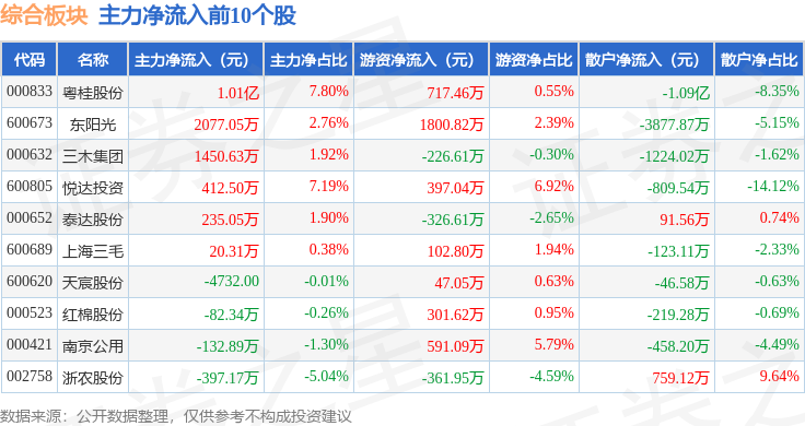 从资金流向上来看,当日综合板块主力资金净流出8457.21万元,游资资金净流入1.43亿元,散户资金净流出5809.73万元。综合板块个股资金流向见下表: