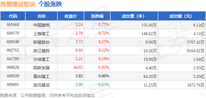 证券之星消息,12月1日房屋建设板块较上一交易日上涨0.65%,中国建筑领涨。当日上证指数报收于3914.01,上涨0.65%。深证成指报收于13146.72,上涨1.25%。房屋建设板块个股涨跌见下表: