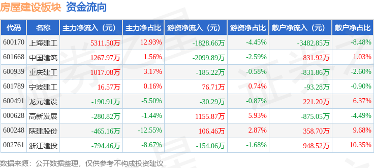 从资金流向上来看,当日房屋建设板块主力资金净流入5881.77万元,游资资金净流出2959.08万元,散户资金净流出2922.69万元。房屋建设板块个股资金流向见下表: