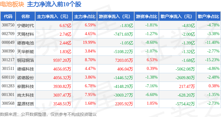 从资金流向上来看,当日电池板块主力资金净流出2.31亿元,游资资金净流入1.88亿元,散户资金净流入4320.69万元。电池板块个股资金流向见下表: