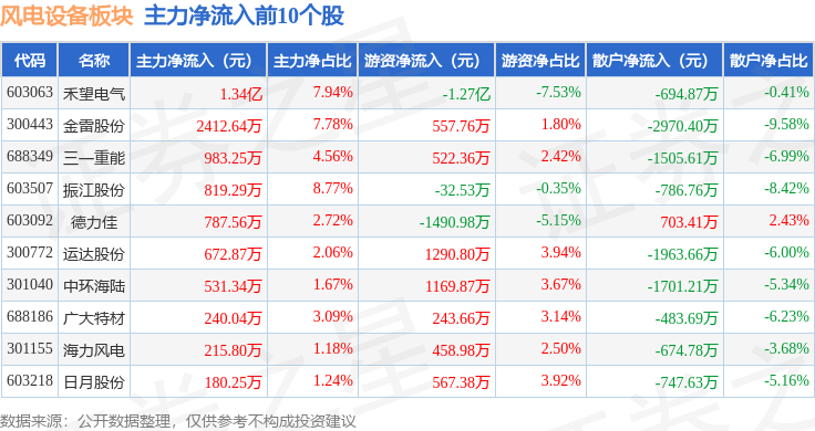 从资金流向上来看,当日风电设备板块主力资金净流出2.45亿元,游资资金净流入6529.7万元,散户资金净流入1.79亿元。风电设备板块个股资金流向见下表: