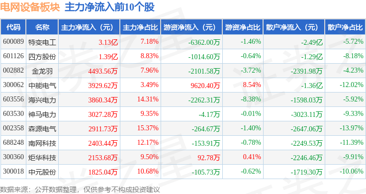 从资金流向上来看,当日电网设备板块主力资金净流出3471.67万元,游资资金净流入5.44亿元,散户资金净流出5.09亿元。电网设备板块个股资金流向见下表:
