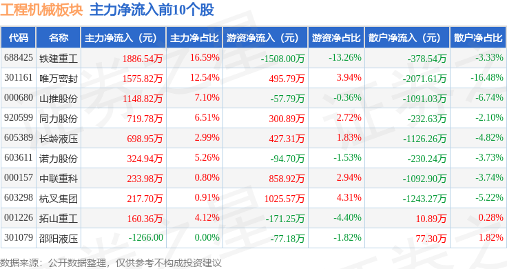 从资金流向上来看,当日工程机械板块主力资金净流出2.86亿元,游资资金净流入6393.76万元,散户资金净流入2.22亿元。工程机械板块个股资金流向见下表: