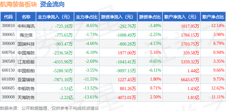 从资金流向上来看,当日航海装备板块主力资金净流出5.95亿元,游资资金净流出4164.37万元,散户资金净流入6.36亿元。航海装备板块个股资金流向见下表: