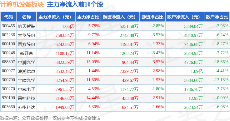 从资金流向上来看,当日计算机设备板块主力资金净流出4.58亿元,游资资金净流入2.99亿元,散户资金净流入1.59亿元。计算机设备板块个股资金流向见下表: