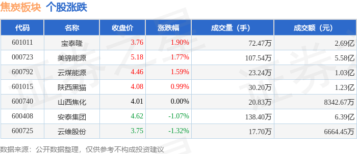 证券之星消息,12月1日焦炭板块较上一交易日上涨0.93%,宝泰隆领涨。当日上证指数报收于3914.01,上涨0.65%。深证成指报收于13146.72,上涨1.25%。焦炭板块个股涨跌见下表: