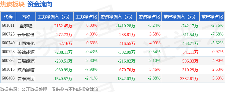 从资金流向上来看,当日焦炭板块主力资金净流出571.85万元,游资资金净流出2446.07万元,散户资金净流入3017.92万元。焦炭板块个股资金流向见下表: