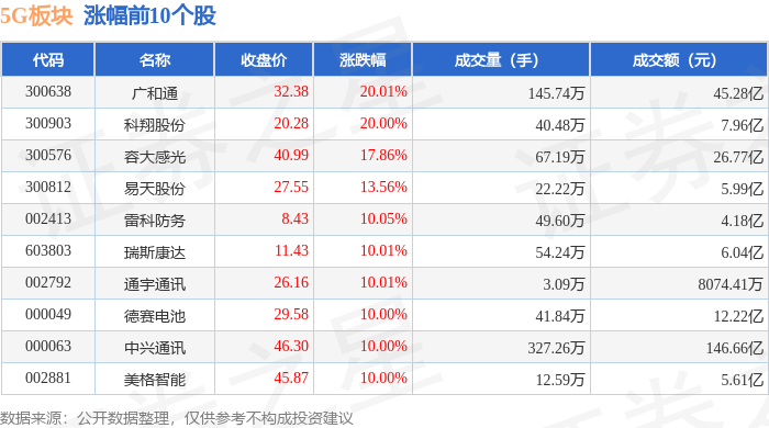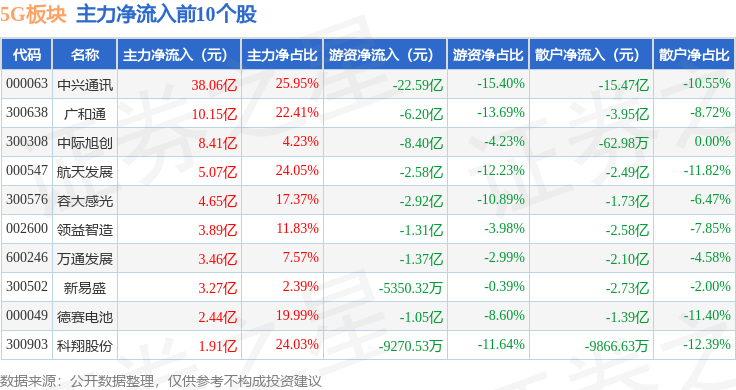 从资金流向上来看,当日5G板块主力资金净流入33.12亿元,游资资金净流出37.39亿元,散户资金净流入4.27亿元。5G板块个股资金流向见下表:
