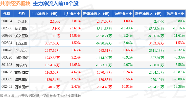 从资金流向上来看,当日共享经济板块主力资金净流入2.93亿元,游资资金净流出4846.71万元,散户资金净流出2.44亿元。共享经济板块个股资金流向见下表: