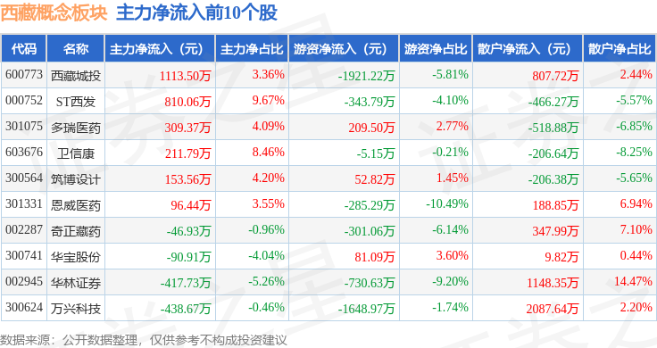 从资金流向上来看,当日西藏概念板块主力资金净流出2.09亿元,游资资金净流出4413.25万元,散户资金净流入2.53亿元。西藏概念板块个股资金流向见下表: