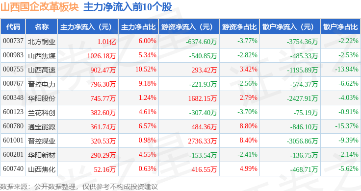 从资金流向上来看,当日山西国企改革板块主力资金净流入1122.08万元,游资资金净流入6057.23万元,散户资金净流出7179.3万元。山西国企改革板块个股资金流向见下表: