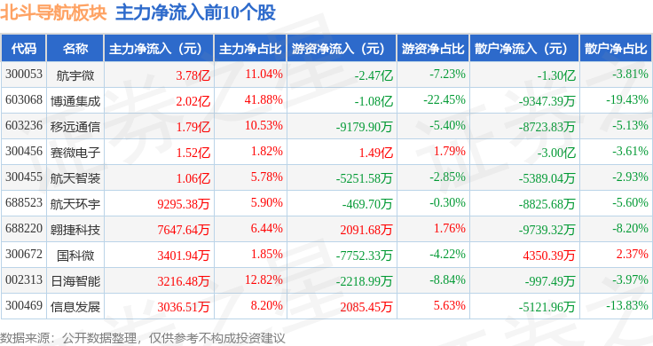 从资金流向上来看,当日北斗导航板块主力资金净流入6.11亿元,游资资金净流出4.54亿元,散户资金净流出1.57亿元。北斗导航板块个股资金流向见下表: