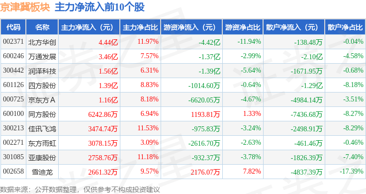从资金流向上来看,当日京津冀板块主力资金净流出2.01亿元,游资资金净流出4.42亿元,散户资金净流入6.43亿元。京津冀板块个股资金流向见下表: