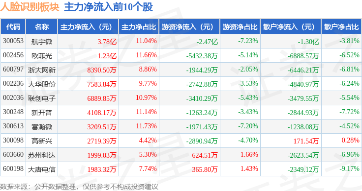 从资金流向上来看,当日人脸识别板块主力资金净流入3.43亿元,游资资金净流出2.54亿元,散户资金净流出8934.06万元。人脸识别板块个股资金流向见下表: