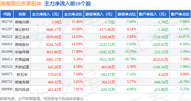 从资金流向上来看,当日湖南国企改革板块主力资金净流入3.56亿元,游资资金净流出1.13亿元,散户资金净流出2.43亿元。湖南国企改革板块个股资金流向见下表: